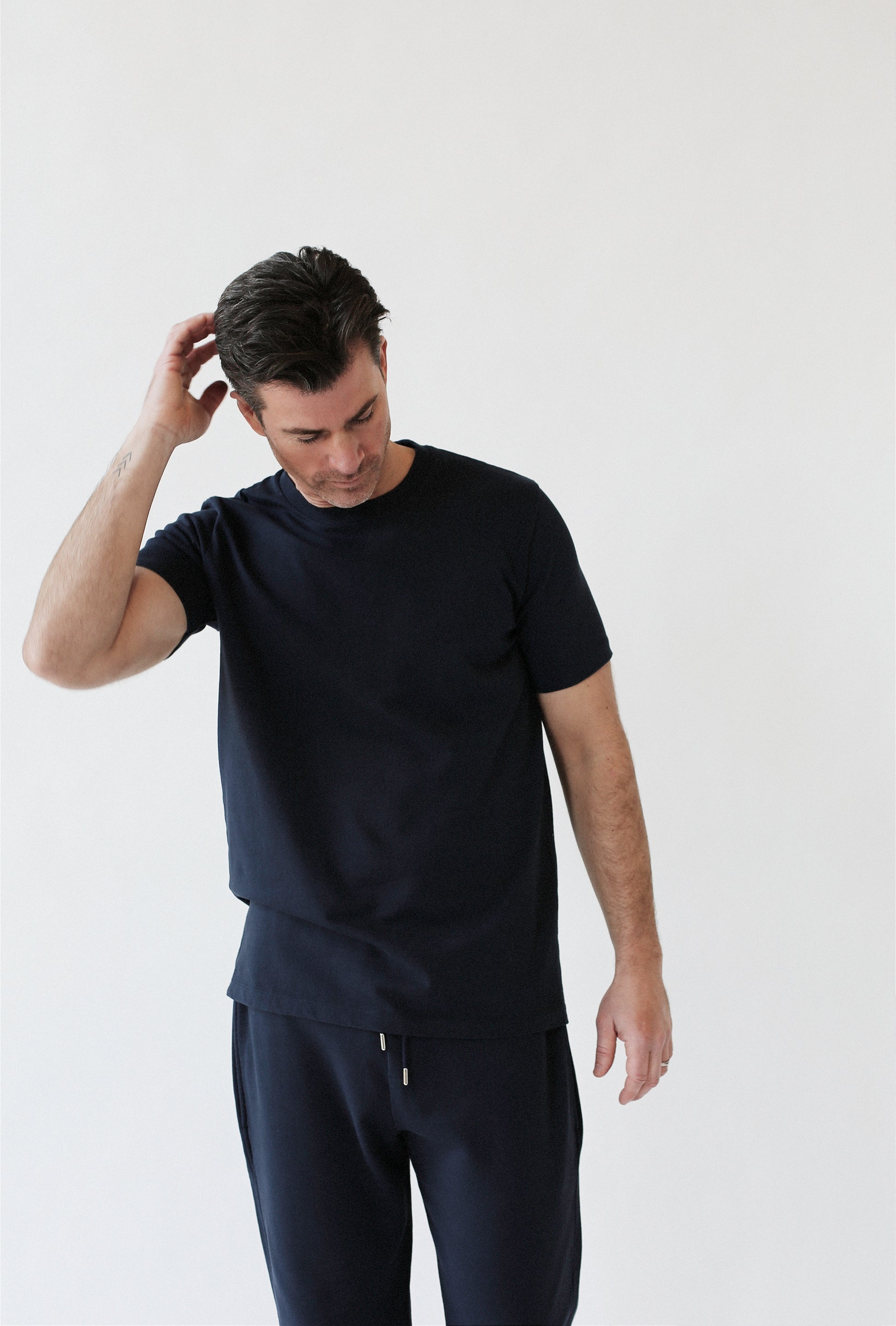 The Ero tee - our new heavy jersey crew tee offers a refined masculine look with a neat fit - combining sturdiness with a soft, premium feel. Designed for versatility and lasting comfort, it’s available in deep navy and chic off-white.